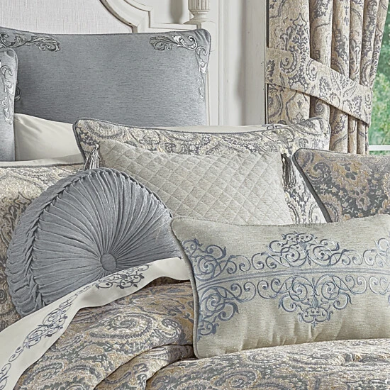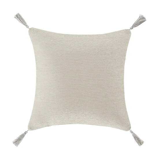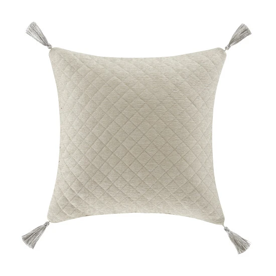 The Angelo 18″ Decorative Throw Pillow is exquisite with its use of silver chenille tones. This beautiful square accent pillow features a diamond quilt pattern on the face with solid chenille on the reverse. An additional detail of this pillow is the 1.5″ tassels inserted into each corner of the pillow. Pair this pillow with the Angelo bedding set by Five Queens Court for a complete elegant look.