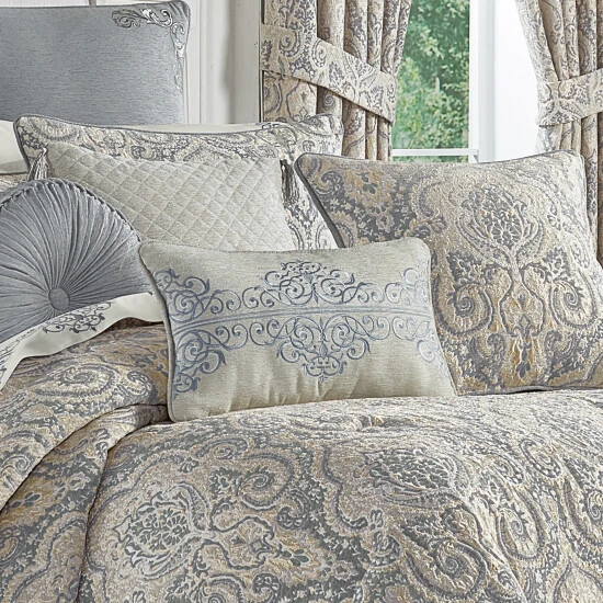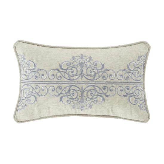 The Angelo Boudoir Throw Pillow is truly stunning with its delicate scroll damask embroidery details. The embroidery uses hints of silver metallic and spa to complement back to the bedding ensemble. The pillow is finished with a solid silver chenille reverse and silver chenille piping. Pair this pillow with the Angelo bedding set by Five Queens Court for a complete elegant look.