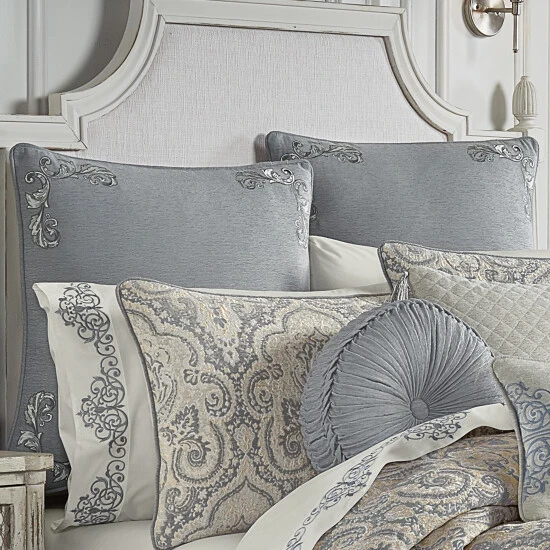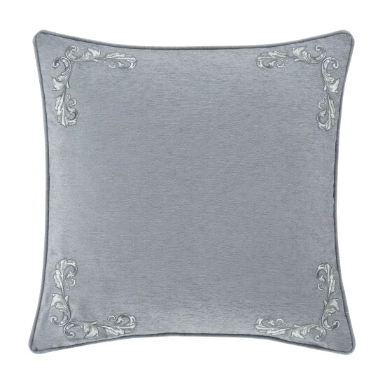 The Angelo Euro sham is elegant with its use of spa chenille and beautiful ornate scroll embroidered details. Each scroll embroidery is placed in the four corners of the pillow adding beautiful detail. The pillow is reversible with a silver chenille reverse and spa chenille piping. Pair this pillow sham with the Angelo bedding set by Five Queens Court for a complete look.