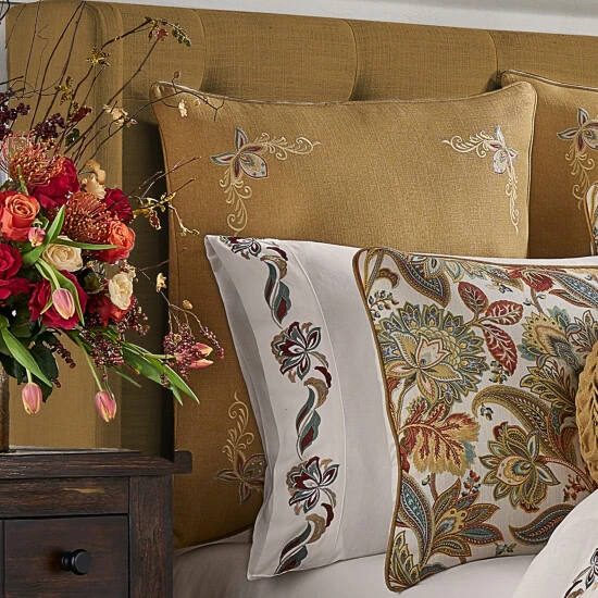 The Euro sham has a woven solid gold face and reverse. The face is embellished with a multicolored floral embroidery placed in all four corners.The fine details include a hidden zipper and 1/4″ gold piping on all four sides.