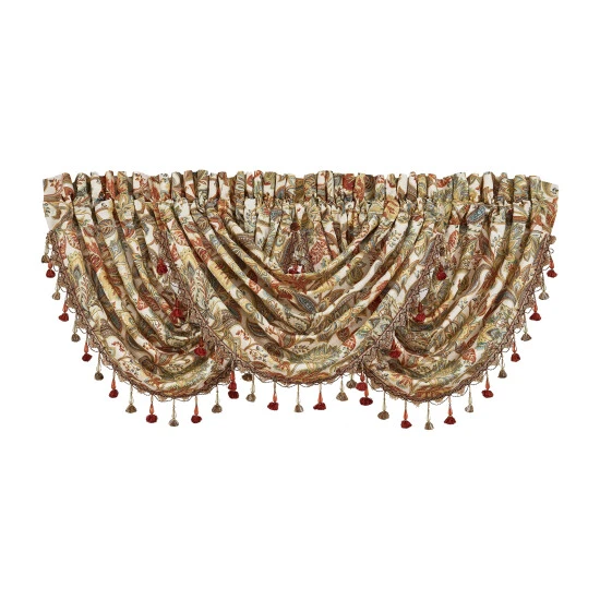 Create a custom look on your window with this waterfall valance made of the same printed jacobean floral design as the panels. The valance is trimmed with a crystal tassel fringe in coordinating colors. In order to achieve the look in the photo, we suggest using three valances.