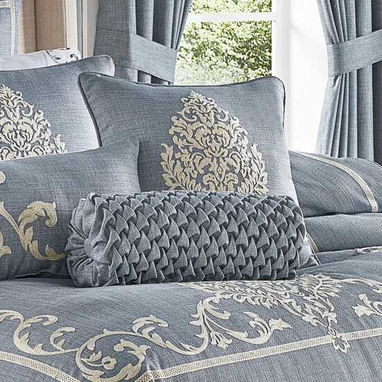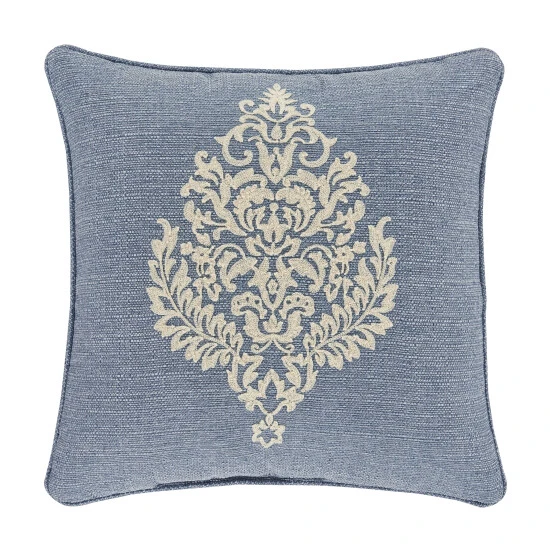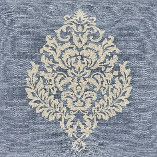 The Augusta 20″ Decorative Throw Pillow features an exquisite chambray blue base cloth and is embroidered on the face with an ivory colored traditional damask pattern using a bold raised crewel embroidery technique. The reverse of this pillow is crafted in a solid blue chambray with a faux linen look that matches back to the top of bed and is finished with a 1/4″ blue piping. Pair this luxury accent pillow with the Augusta bedding set by Five Queens Court for a complete look.