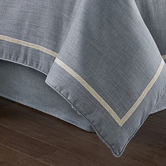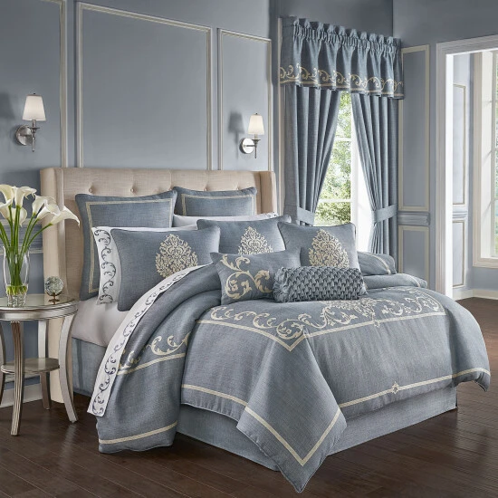 The Augusta 4 Piece Comforter Set Bedding Collection is simple and classic with its fine details and bold blue chambray colors. The beautiful woven heathered effect is enhanced with a traditional ivory damask pattern and border embroidery for added detail. Paired with matching hidden zipper closure pillow shams and an engineered faux linen split-corner bedskirt, this oversized ensemble will add timeless elegance to your bedroom decor. The reverse of the comforter features a plush microfiber dyed to match the blue base cloth on the front and is finished with a 1/4″ blue piping. Add the coordinate throw pillows, Euro shams, and window treatments to complete the look.