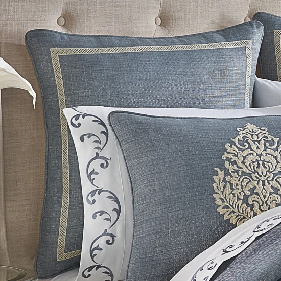 The Augusta Euro Sham is simple yet beautiful, with a classic ivory border embroidered in a crewel technique. This 26″ Euro sham features a hidden zipper closure and is finished with a 1/4″ blue piping for a lovely backdrop to your bedding ensemble. Pair this pillow sham with the Augusta bedding set by Five Queens Court for a complete traditional look.