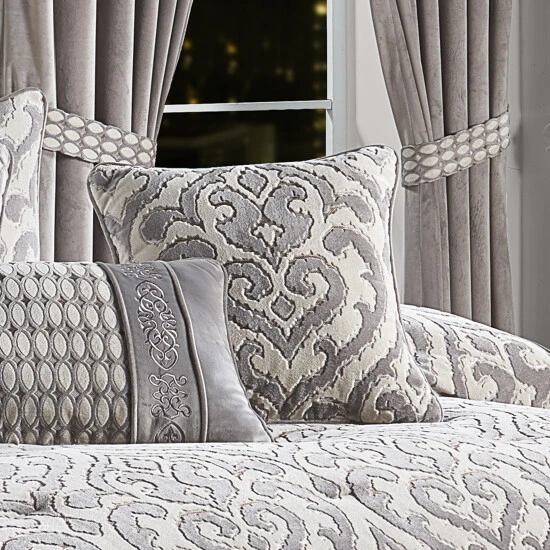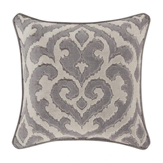 The Belford 18 inch square decorative throw pillow is luxurious and elegant with an incredibly soft hand from the woven velvet design. This alluring medallion square pillow matches directly to the top of bed design in a lovely silver tone. The pillow offers a gorgeous reversible velvet diamond pattern , adding the option to use both sides and finished with a 1/4″ silver gray piping. Pair this pillow with the Belford Bedding set by Five Queens Court for a showstopper complete look.