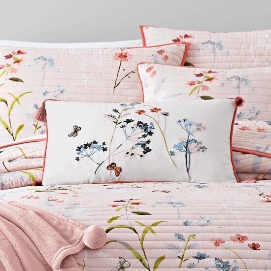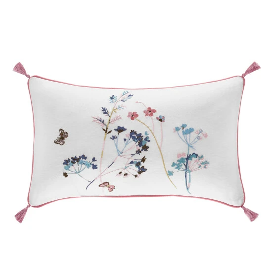 The 12″ x 20″ boudoir pillow is embroidered with a floral motif and finished with a fun tassel trimming.