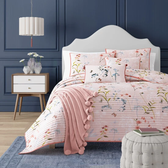 Bring fresh florals to your contemporary bedroom with the Blakely coverlet from Five Queens Court. The rose-colored cotton coverlet is detailed with horizontal stitching and patterned with a blue and green floral design. Choose from three sizes to outfit your guest room or master bedroom.