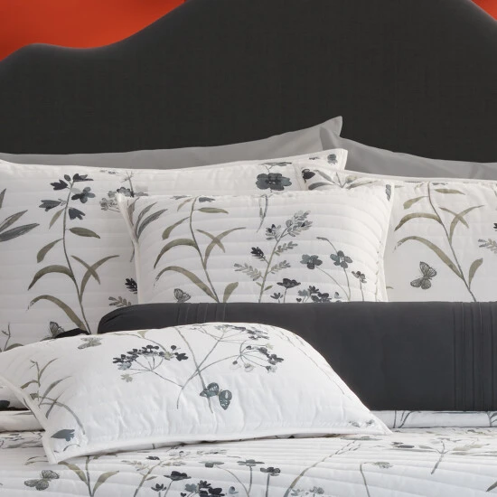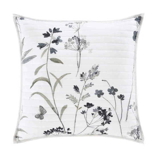 The Bonnie Grey 18 Inch Quilted Throw Pillow adds botanical beauty to your bedding or favorite sofa. Elegantly patterned with long-stemmed watercolor florals in neutral grey colors, allΒ on a crisp white 100% Cotton fabric. This accent pillow is plush to the touch and gets softer over time, making it a perfect finishing touch to your home decor. Add the coordinate comforter set or quilt to complete the look.