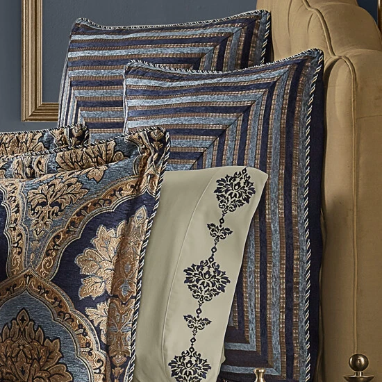 The Bristol Euro Sham is beautifully engineered with a traditional woven stripe mitered on the face. The reverse of this sophisticated pillow features a simple yet beautiful indigo faux silk solid color fabric. This 26″ Euro Sham is the perfect backdrop to this traditional collection. This pillow sham is reversible and is finished with a decadent tri-color twist cord and hidden zipper closure. Pair this Euro sham with the Bristol bedding set by Five Queens Court for a complete look.