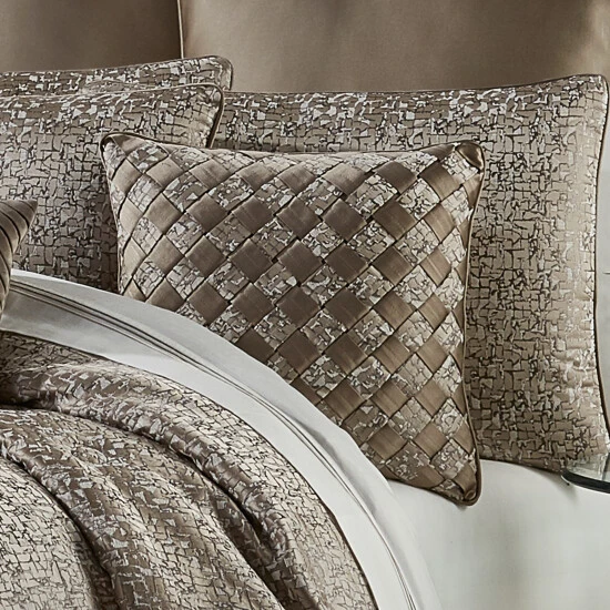 The Calgary 18″ decorative pillow is constructed into a grid pattern by hand weaving alternating strips of fabric. This one of a kind accent is sleek and contemporary and a great addition to this collection.