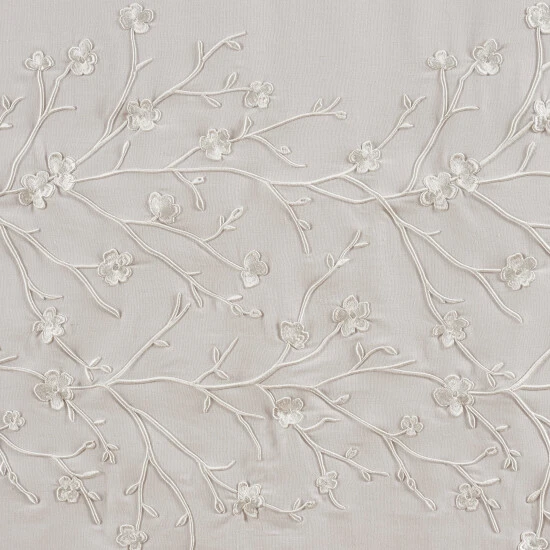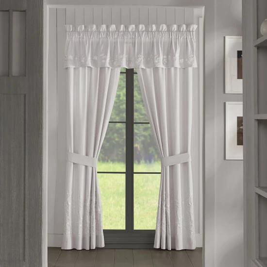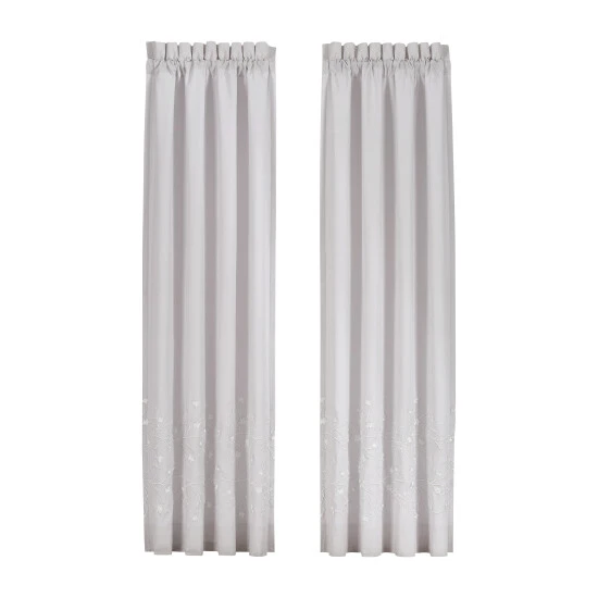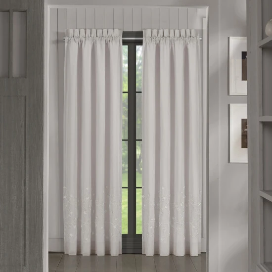 The Cherie Panel Pair is sophisticated and clean with its soft neutral grey tone and floral embroidery details. This beautiful panel pair features a unique raised 3D embroidered floral in white thread on a 100% Cotton fabric. These lined panels include tiebacks to create an open airy look and keep your room comfortable throughout the day. The 3″ header and 3″ rod pocket make these panels easy to hang. Pair these panels with the Cherie bedding set by Five Queens Court for a complete look.