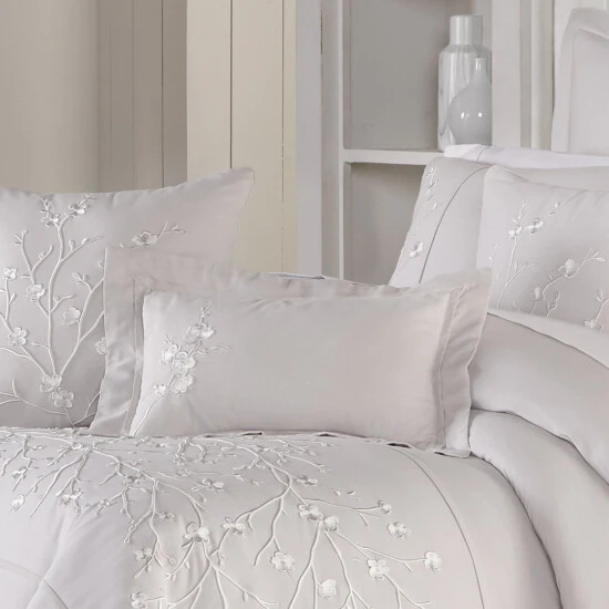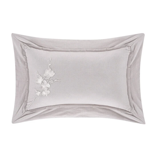 The Cherie Boudoir Pillow is beautifully crafted with a unique raised embroidered floral design in white thread to emphasize the soft neutral grey fabric. This decadent 100% Cotton accent pillow is pleated and finished with a lovely flange detail. Pair this pillow with the Cherie bedding set by Five Queens Court for a complete look.