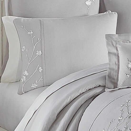 The Cherie Bedding Collection is sophisticated and timeless with its neutral soft grey color and white floral embroidery details. This beautiful cherry blossom floral pattern is constructed with a truly special raised 3D embroidery, done in a contrasting white thread color to emphasize the 100% Cotton soft grey base. Paired with included matching shams this oversized ensemble will add tasteful traditional Country style to your bedroom decor. Add the Cherie Euro Sham, Throw Pillows, and Window Treatments by Five Queens Court to complete the look.Β