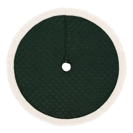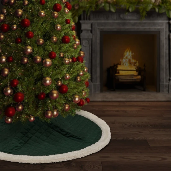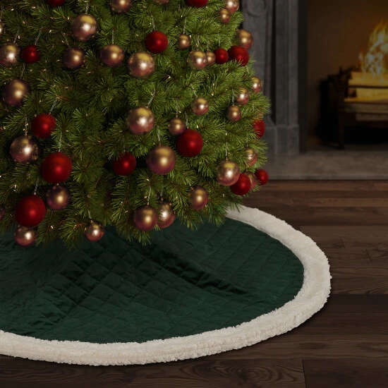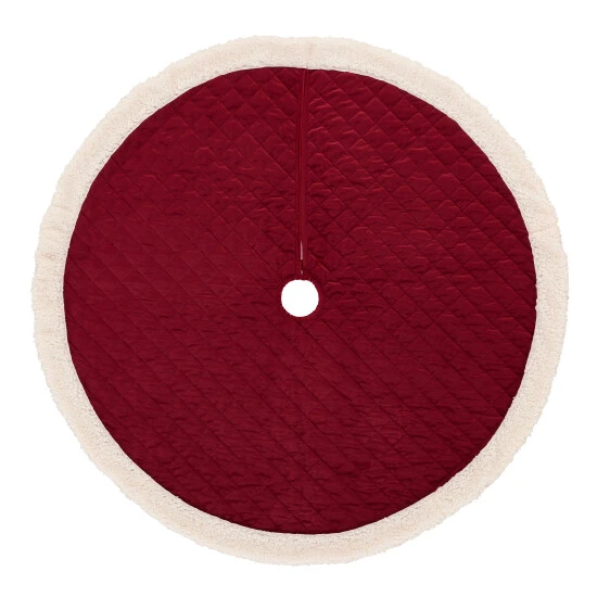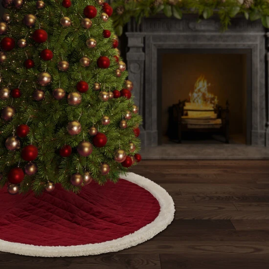 The Cozy Holiday Tree Skirt will be the favorite addition to your Christmas decorating collection. The diamond quilted velvet with white sherpa trim also matches beautifully with the other items in the Cozy Holiday collection, which includes a stocking , quilt set, throw blanket, and throw pillow (each sold separately). Available in Christmas crimson or evergreen color options.