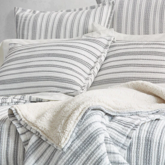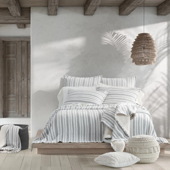 Crafted in Portugal from exceptionally fine 100% Cotton yarns, the Crystal Cove Throw Throw offers Malibu Beach House inspired indulgence and incredible comfort. Featuring a heavyweight construction, this plush throw blanket is uniquely woven with a soft crinkled textured in white and grey stripes with a warm Sherpa reverse. Add this stylish plush throw as a gorgeous neutral layer to your sofa or with the Crystal Cove collection to complete the look.