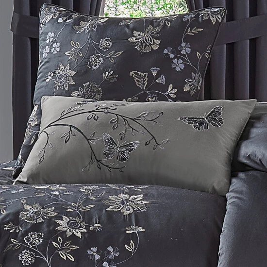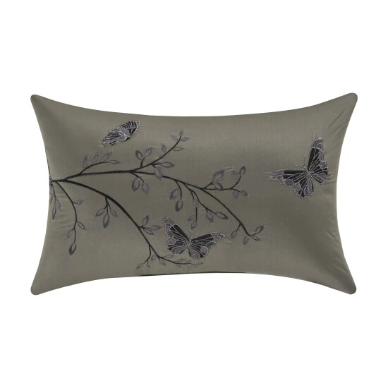 The Danielle Boudoir accent pillow features a grey satin fabric with floral embroidery and beautiful butterfly accents. Pair this 15 x 21 inch 100% Cotton pillow with the Danielle bedding set by Five Queens Court for a complete elegant look.