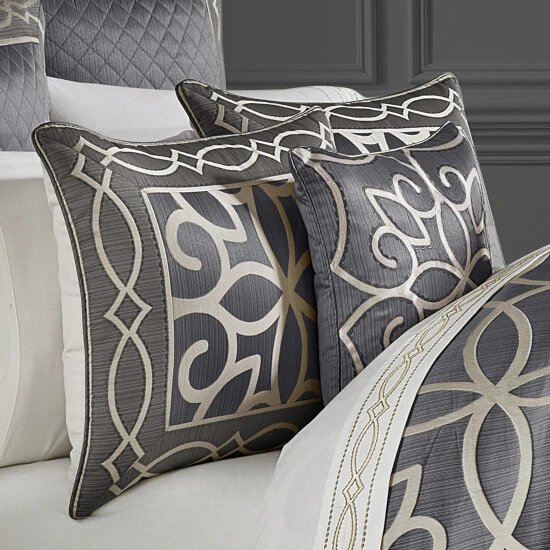 The Darwin Charcoal 4 Piece Comforter Set Collection features a highly constructed sleek engineered jacquard with bordered edges. This alluring modern geometric motif is constructed with a puff technique which sits on a lustrous stria satin ground in industrial charcoal grey tones. This comforter is generously oversized and overfilled for a sophisticated look. The matching hidden zipper closure pillow shams are engineered with a sleek border showcasing the geometric motif. The bedskirt has extra length and is constructed with a split corner tailored finish and the coordinating stria satin is bordered with a geometric puff jacquard finish. Coordinate Darwin Charcoal accent pillows, shams, and window treatments by Five Queens Court are available separately.