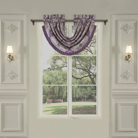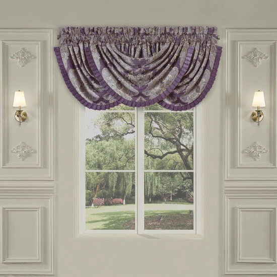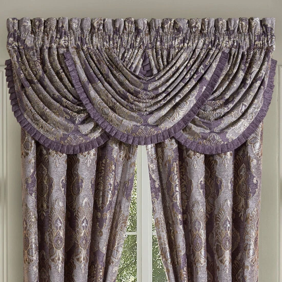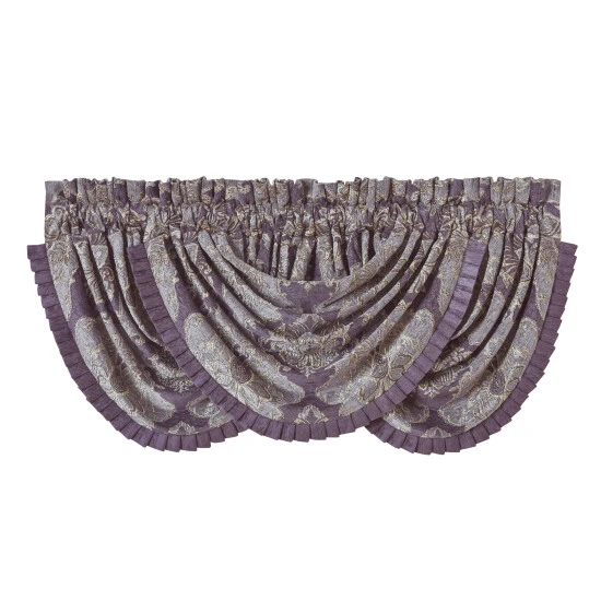 The Dominique Waterfall Valance is exquisite with its fine details and sophisticated use of gold and lavender. This beautiful woven jacquard damask window treatment is rich with its 3-dimensional weave and satin finish. Embellished with a pleated fringe, this valance will add luxurious elegance to your decor. Window shown with three valances (each sold separately).