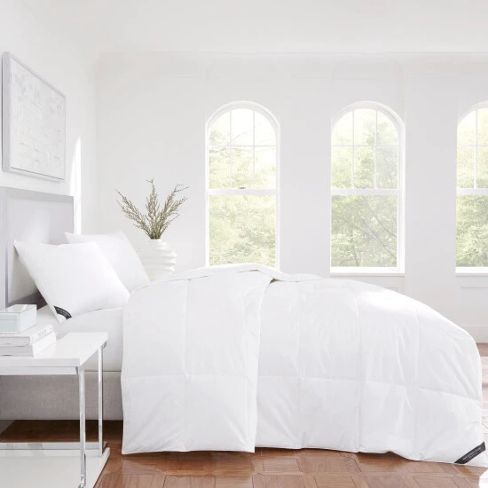 The Elegance down-alternative comforter by Five Queens Court, features an ultra-soft 100% cotton breathable fabric, which is specially engineered with an allergen-barrier fabric to guard against dust mites, pet dander, pollen, and other allergens from inhabiting the comforter. Filled with our exclusive ultra lofty hypoallergenic fiberfill, which provides a silky-smooth sleep surface, all-seasons warmth, and serene down-like softness for a luxurious nights’ sleep. The sewn-thru box stitching construction prevents fiber shifting and the piped edges give it a fine finish. The comforter is generously oversized and available in Twin, Full/Queen and King sizes to fit any bed size.