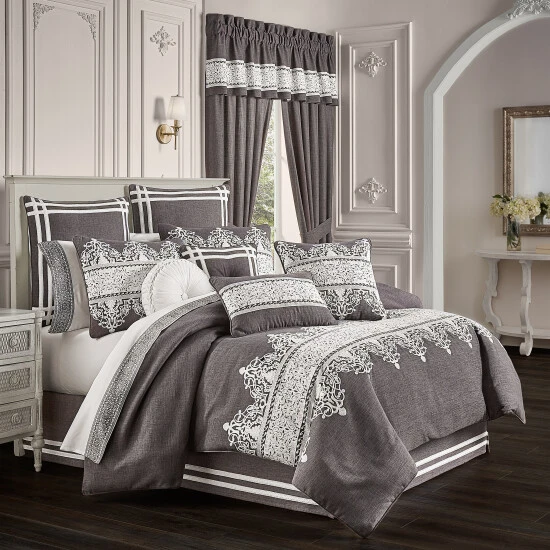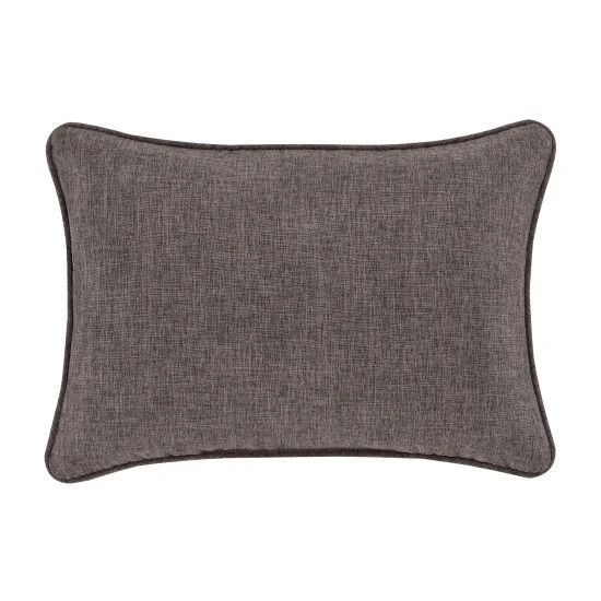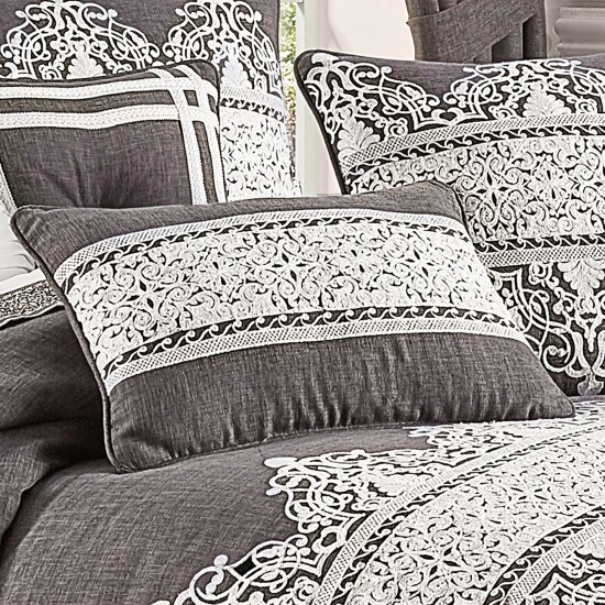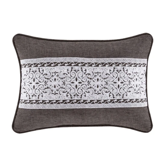 The boudoir pillow has an intricately detailed white embroidered design running horizontal centered on the face. The face and reverse are made with a heather charcoal grey faux linen base fabric. The pillow is finished with 1/4″ grey colored piping.