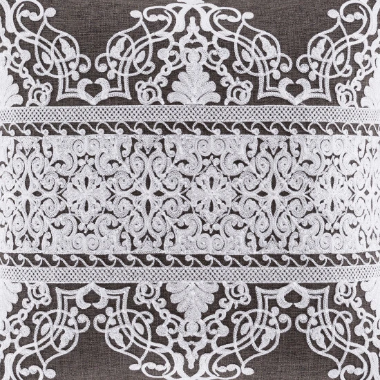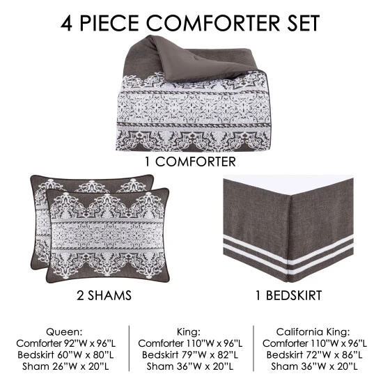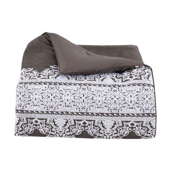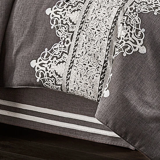 Florence is a beautifully embroidered highly detailed luxury bedding collection. White damask embroidery runs horizontal across the heathered charcoal grey faux linen comforter. The oversized comforter is embellished with 1/4″ piping. The four piece set includes one comforter and two perfectly matched padded pillow shams with a hidden zipper. The pillow shams are engineered, centering the embroidered damask and finished with 1/4″ piping. The bedskirt is a solid faux linen with 2 rows of gimp running at the bottom. This ensemble will add designer elegance to your bedroom decor.