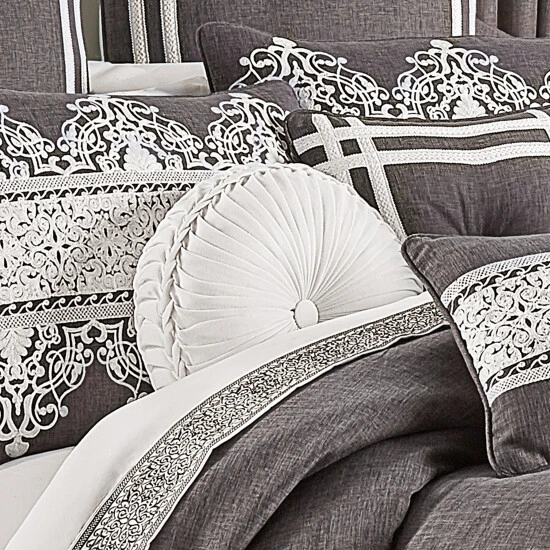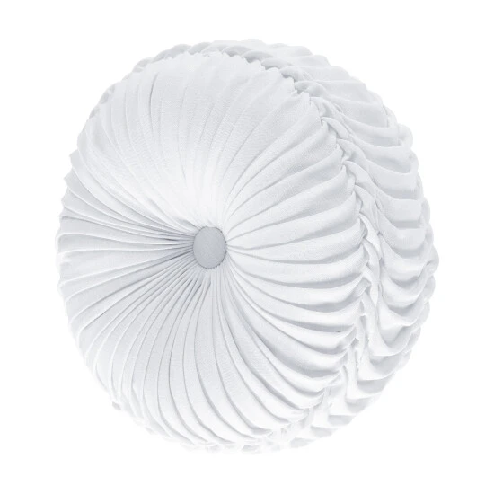 The tufted round pillow uses white colored faux linen to create a one of a kind accent to this bedding ensemble. These unique pillows are sewn by hand and are finished with a fabric-covered button on both sides.