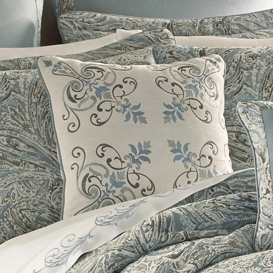 Give your bedding a fancy, vintage look with this lovely square throw pillow. The white chenille face features an elegant, intricate embroidered pattern in blue, brown, and grey hues. This reversible pillow is soft and comfy, and perfectly matches other pieces from Five Queens Court’s Garrison collection.