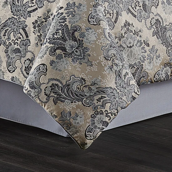 This delightful four-piece comforter set shows off its fine details and bold use of indigo and silver tones. Its woven jacquard floral damask pattern is topped off with a gorgeous satin finish. Paired with matching hidden-zipper pillow shams and a solid indigo satin split-corner bedskirt, this oversized ensemble will make you feel like royalty.