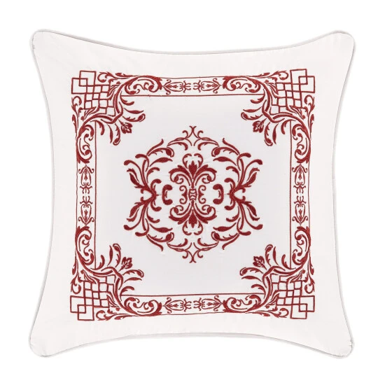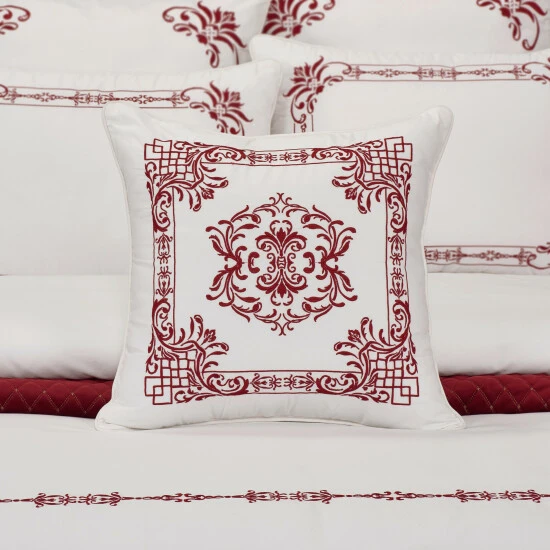 The Home For The Holiday Throw Pillow is specially handcrafted to coordinate with the Duvet Set. A 300 Thread Count 100% Cotton Sateen white ground is paired with handcrafted crimson red embroidery details. The exquisite details include full embroidered corners and a center medallion, sure to get you many compliments. The pillow is finished with a self-cord edge, and the reverse has a hidden zipper for easy cleaning and storage.