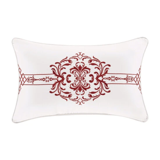 The Home For The Holiday Boudoir Throw Pillow is specially handcrafted to coordinate with the Duvet Set. A 300 Thread Count 100% Cotton Sateen white ground is paired with handcrafted crimson red embroidery details. The exquisite details include a fully embroidered center medallion, sure to get you many compliments. The pillow is finished with a self-cord edge, and the reverse has a hidden zipper for easy cleaning and storage.
