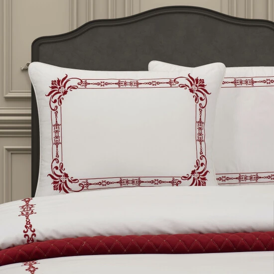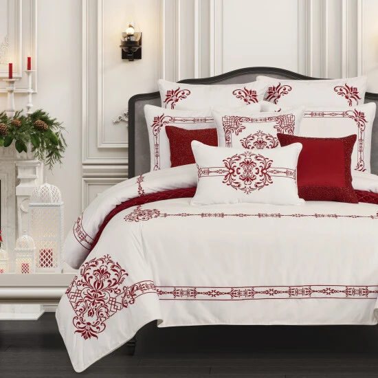 The Home For The Holiday Duvet Cover Set is what dreams are made of. A 300 thread count 100% Cotton sateen white ground is paired with handcrafted crimson red embroidery details, which is sure to become the luscious holiday gift to yourself. The duvet cover and shams are finished with a self-cord edge trim for a tailored finish. The Duvet cover has hidden buttons and the shams have a hidden zipper closure. You’ll leave this on your bed to stay cozy and comfortable long after the holidays.