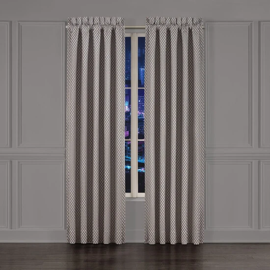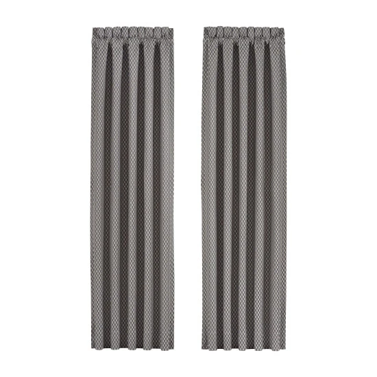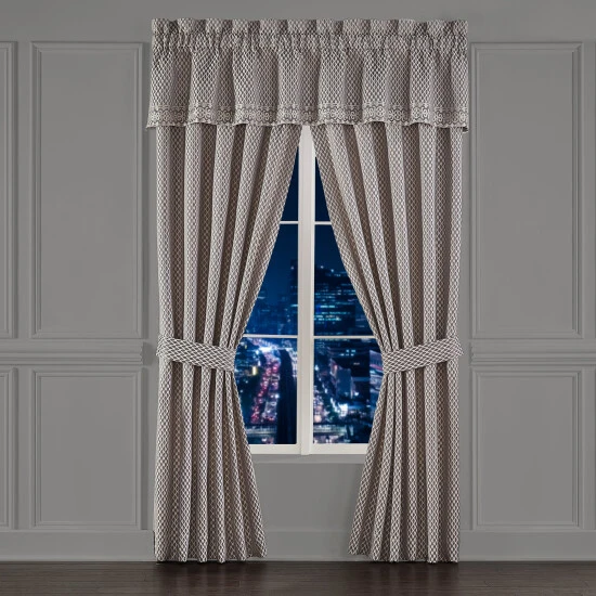 The Houston Window Panel Pair is simple yet exquisite with its use of charcoal and cream colors. This lattice pattern is the perfect touch to complete a transitional look to your decor. The panel’s reverse lining provides a room darkening light filtration that will keep you comfortable throughout the day. The 3″ header and 3″ rod pocket top construction allows for easy setup and the included tiebacks make these panels easy to hang. Pair these panels with the Houston bedding set by Five Queens Court for a complete elegant and sophisticated look.