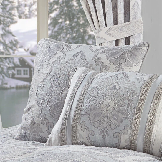 The Icy Bay 20″ Decorative Throw Pillow is exquisite with its sophisticated use of ice blue and silver tones. This beautiful square pillow is rich with a traditional woven jacquard damask design on the front and detailed stripe on the back. This pillow is reversible, with a soft chenille finish on each side and finished with a 1/4″ ice blue piping for added elegance. Pair this pillow with the Icy Bay Bedding set by Five Queens Court for a complete look.