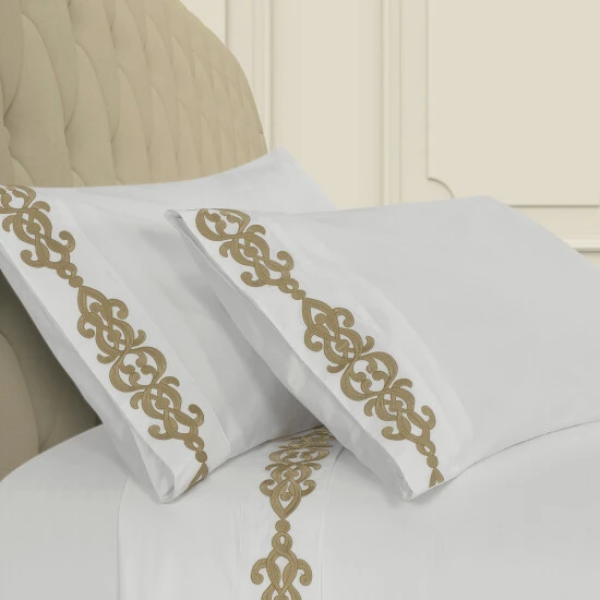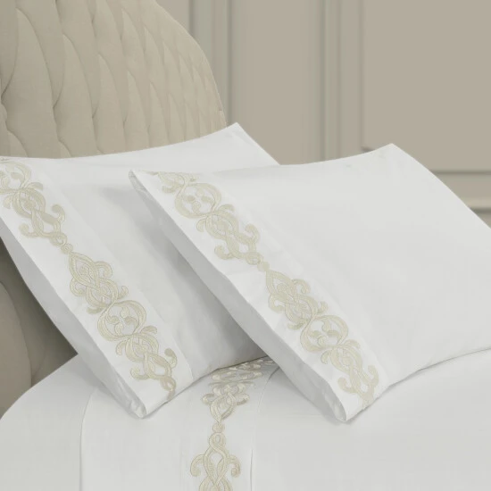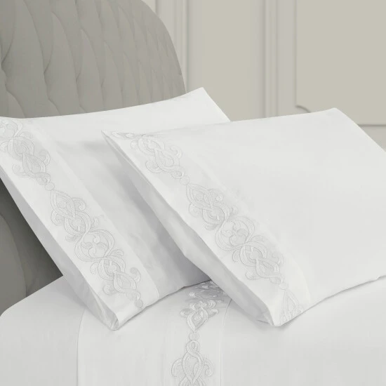Add a luxurious foundation to your bed with the Isabel Embroidered Pillowcase Pair. Featuring an updated stylized scroll embroidery design, detailed with a darker stitch outline for a stunning shadow effect and further definition. Crafted with plush 100% Cotton fabric that feels cool, soft to the touch, and breathable for a rejuvenating night’s sleep. The pillowcases are available in multiple colors to coordinate beautifully with the Five Queens Court Bedding collections and are machine washable for easy care.