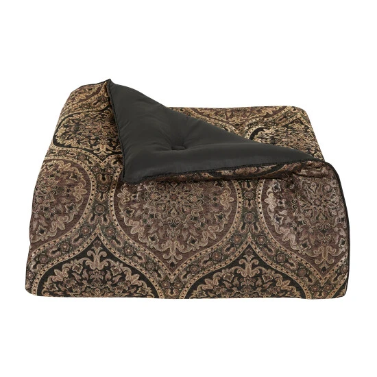 The Jeremy 4 Piece Comforter Set features an intricately woven traditional damask in shades of brown, black and glimmering golds. The rich chenille mingled with high twist yarns creating depth and an array of textures making this baroque design a classic. Paired with matching hidden zipper shams and a split-corner chenille bedskirt in navy the Jeremy Collection is a showstopper.