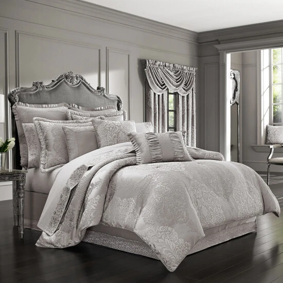 Grand scale opulence in rich tone of silver, pewter, and platinum. The large scale ornate damasks set the stage for dramatic decorating. The comforter has been carefully cut and sewn to ensure that the intricate design is always perfectly centered. Giving the ensemble a custom look a unique finishing process gives the fabric a relaxed and three dimensional texture.Queen size dimensions: 92×96 King size dimensions: 110×96 Cal King size dimensions: 110×96 Care Instructions: Dry clean only Fabric content: 100% Polyester Fill content: 100% Polyester Reverse of Comforter: 100% Polyester Imported