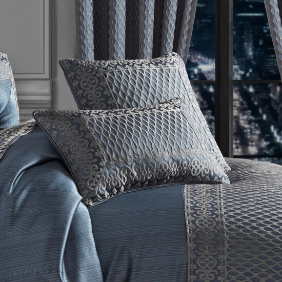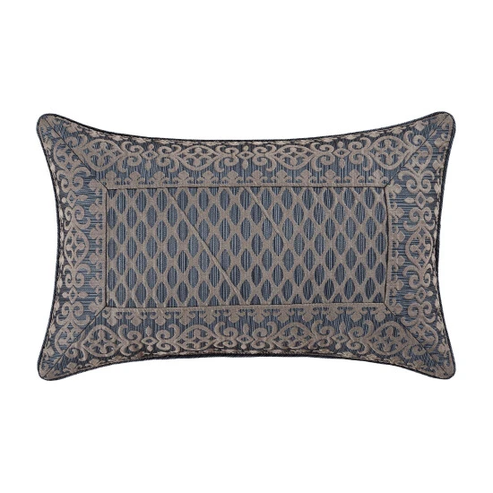 The Leah Boudoir Throw Pillow is casual yet sophisticated with its use of blue and cream. This beautiful accent pillow is rich with a traditional woven scroll stripe border surrounding a lattice pattern center. This pillow reverses to a woven blue stria and is finished in 1/4″ piping. Pair this decorative pillow with the Leah bedding set by Five Queens Court for a complete look.