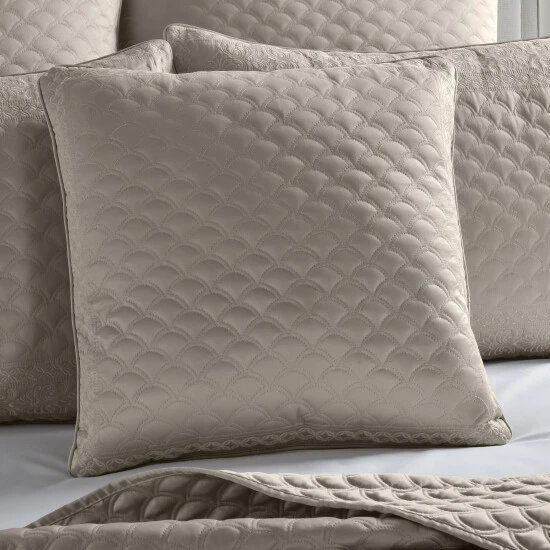 The Lincoln 20 Inch Decorative Throw Pillow is a direct coordinate to the Lincoln Coverlet. It contains a stunning matte satin fabric, machine quilted and bordered with a timeless foulard embroidery and accented with 1/4″ satin piping for a fine finish.