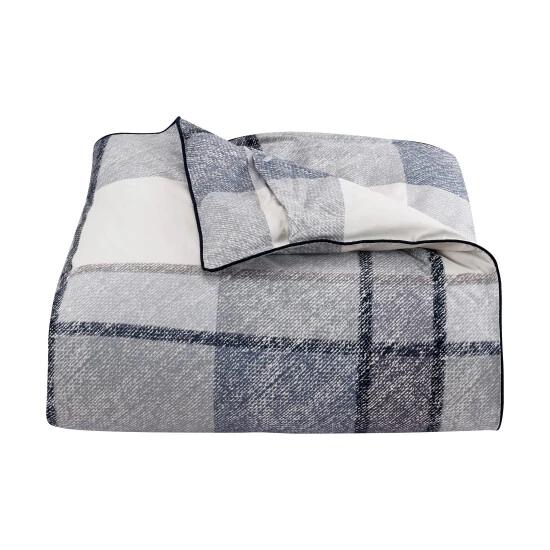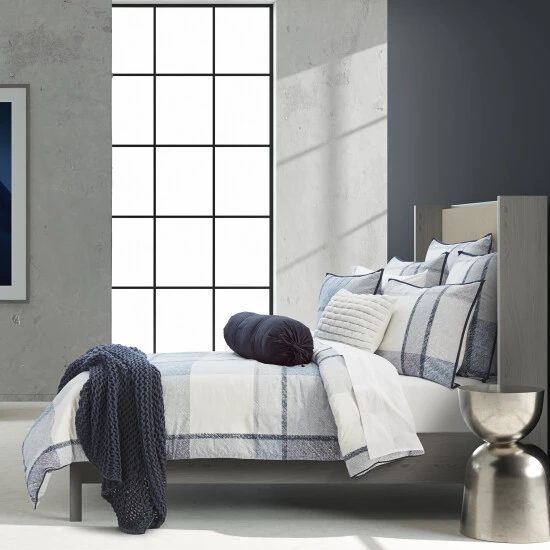 The Louis Duvet Cover offers a classic and sophisticated style to your decor. A modern oversized plaid design is printed on plush 100% brushed cotton twill.Β Textured shades of blues and greys, are contrasted with rich indigo blue and crisp white that compliments any dΓ©cor. The duvet is completely reversible and finished with solid indigo binding and a hidden button closure.
