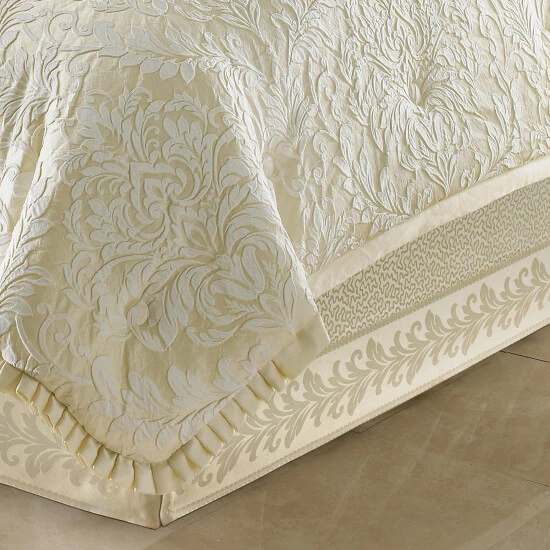 An opulent and grand scale French damask design. The colors are a rich vanilla and cream. The unique fabric is finished with a special washing process giving it a relaxed and three-dimensional quality. This luxurious ensemble is designed to give “interior decorator appeal” to any bedroom.The 4 pcs set includes: Begin to create your dream room with the four-piece comforter set. The set includes the comforter, bedskirt and two pillow shams. All the items in the ensemble have elegant accents and are carefully cut and sewn to insure the highest level of quality. The comforter spotlights the “grand damask”. Attention to detail insure that every comforter is cut at the same point to insure they each will be the same. The finished details include a 1.5″ folded satin flange that is pleated at the corners and a “button quilt pattern”. The reverse is a matching ivory solid smooth fabric. The bedskirt introduces the coordinating fabric used throughout the ensemble. A “Vermicelli texture” is used as the drop and finished with a French scroll border. The pillow shams are cut identically, centering the grand damask and finished with a 1.5″ stain flange that is pleated on every corner. The reverse of the sham is a coordinating, smooth solid fabric and finished with zippered closures.