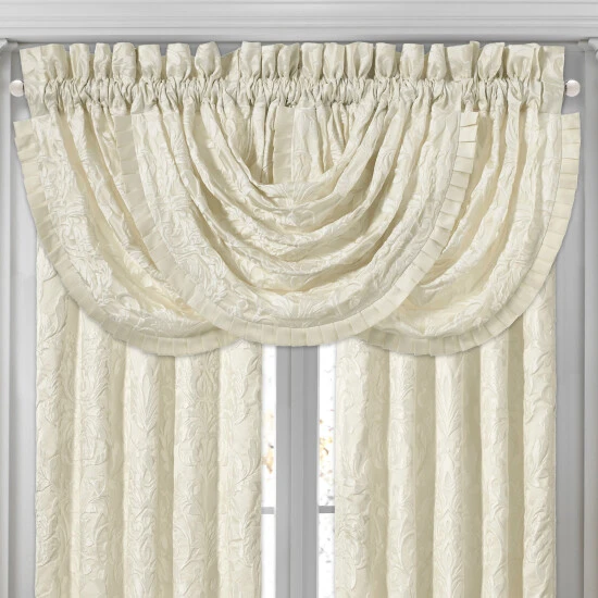 Designed for the ultimate look of luxury. The waterfall valances use the grand damask fabric and are trimmed with a pleated stain flange. They are lined and have 3″ header with 3″ rod pocket.