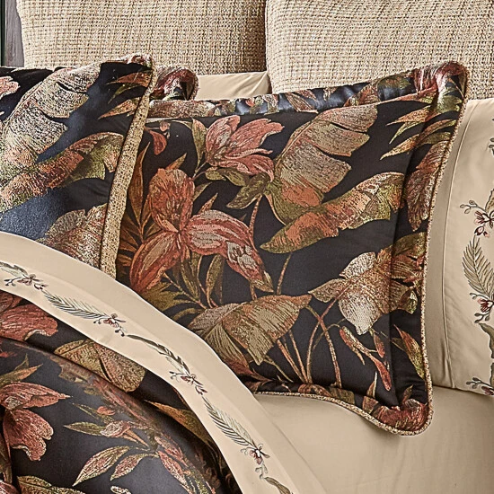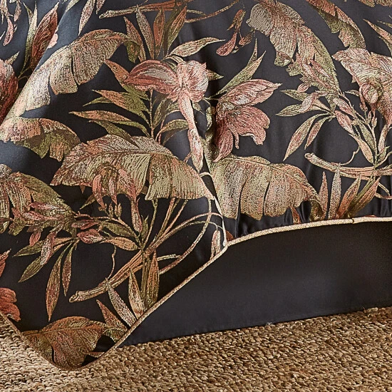 The Martina 4 Piece Comforter Set Bedding Collection is exquisite with its fine details and bold use of black, coral, and Earth tones. This beautifully printed tropical pattern featuring palm leaves and flowers is sophisticated with a unique dry fabric finish to give it casual yet upscale coastal appeal. Paired with matching hidden zipper pillow shams and a solid black split corner bedskirt, this oversized ensemble will make you feel like a you’re on a relaxed beach front vacation. The reverse of this set features a plush microfiber dyed to match the black ground of the tropical print and finished with a 1/4″ gold piping for added detail. Pair this comforter set with the Five Queens Court Martina window treatments, throw pillows, and Euro shams for a complete island resort look.