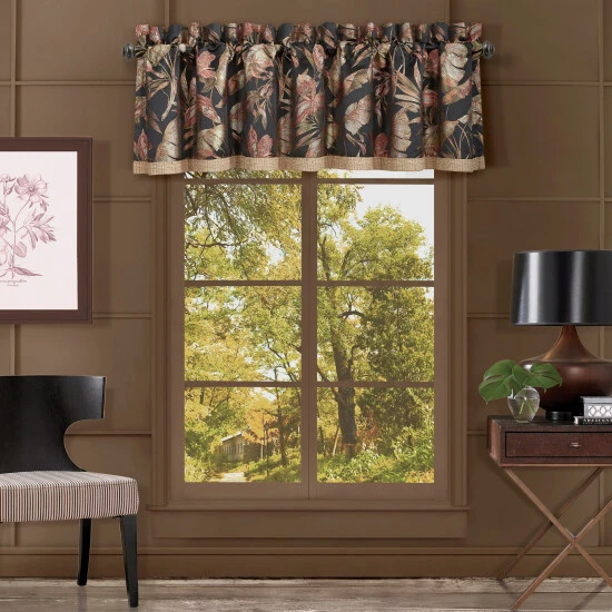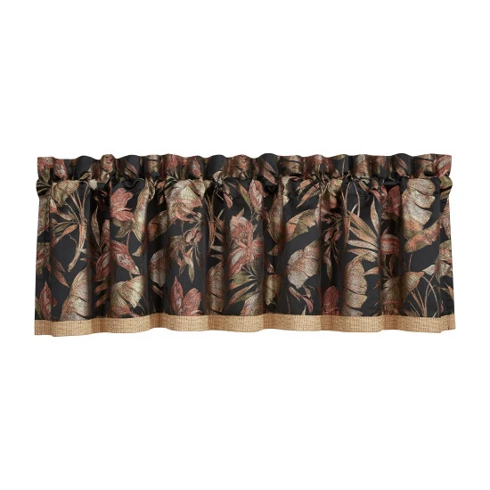 The Martina Straight Window Valance is exquisite with its fine details and bold use of black and coral tones. This beautiful printed tropical pattern featuring palm leaves and flowers is sophisticated yet fun. Finished with a lovely textured gold tweed fabric at the bottom, this valance is the perfect finishing touch to this grand tropical design. The 3″ header and 3″ rod pocket make this valance easy to hang. Pair this valance with the Martina window panels and bedding collection for a complete look.