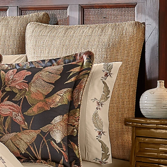 The Martina Euro Pillow Sham is unique and tropical with a textured woven gold tweed fabric. This pillow sham is reversable, with a solid black dry finish, hidden zipper closure on the back, and finished with a 1/4″ textured gold piping for added detail. Pair this pillow with the Martina bedding set by Five Queens Court for a complete coastal look.