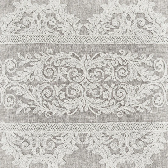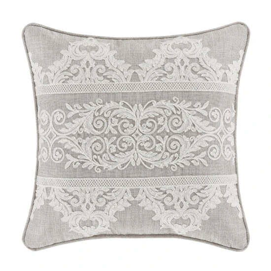 The Maryanne 18″ Decorative Pillow is exquisite with its sophisticated use of beige and cream colors. This beautiful square pillow is sophisticated with a transitional, ornate embroidered design on top of a beige faux linen. This embroidered design features an intricate damask and scroll pattern relating back to the top of the bed and is finished with a 1/4″ beige piping. Pair this pillow with the Maryanne bedding set by Five Queens Court for a complete look.