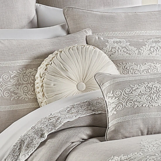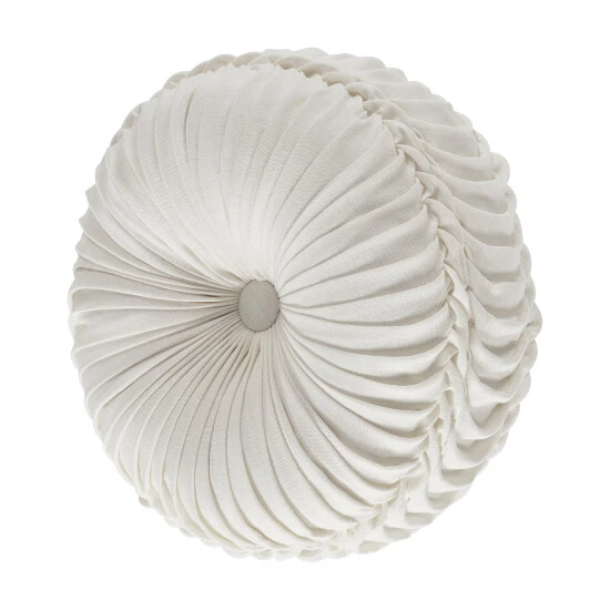The Maryanne Tufted Round Pillow uses a beautiful white faux linen fabric to create a one of kind accent piece to this bedding ensemble. The 15″ unique pillow is sewn by hand and is finished with a fabric covered button on both sides. Pair it with the Maryanne bedding set by Five Queens Court for a complete look.