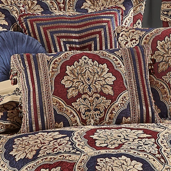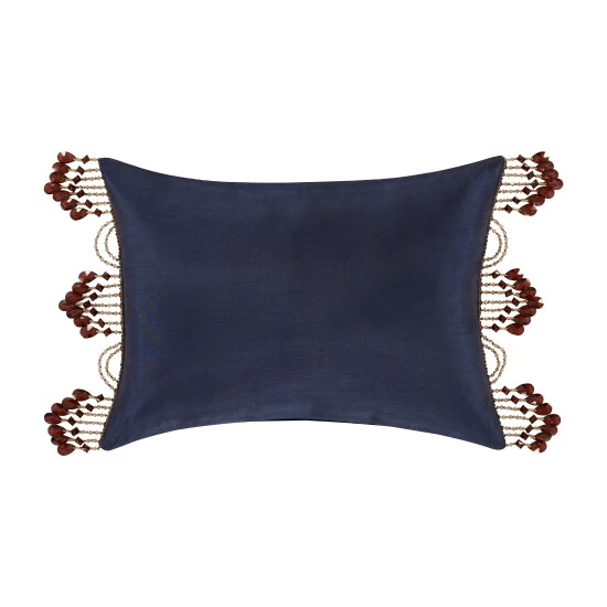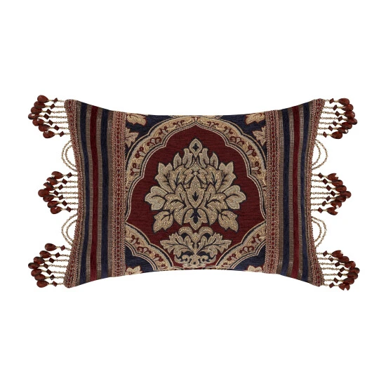 The Middleton Boudoir is beautifully pieced with a centered woven jacquard damask and a woven striped chenille detail. This decadent pillow is embellished with a sparkling crystal tassel fringe and braided gimp to complete the traditional luxury look. Pair this 15 x 21 inch pillow with the Middleton bedding set by Five Queens Court for a complete elegant look.