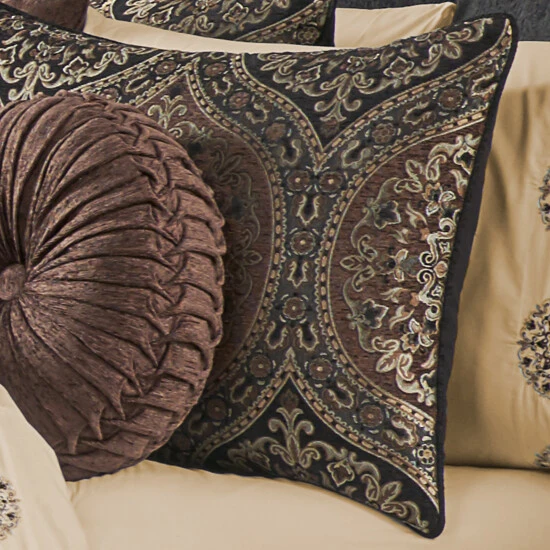 The Monaco 4 Piece Comforter Set Bedding Collection is exquisite with its fine details and sophisticated use of chocolate and gold colors. This beautiful woven jacquard medallion ensemble is rich with design house quality fabric and a soft chenille finish. Paired with matching hidden zipper closure shams and a solid black chenille split-corner bed skirt, this oversized ensemble will add timeless style to your bedroom decor. The reverse of this set features a plush solid microfiber dyed to match the black base of the front pattern and is finished with a 1/4″ chocolate chenille piping. Pair this collection with the Monaco throw pillows and window treatments by Five Queens Court to complete the look.