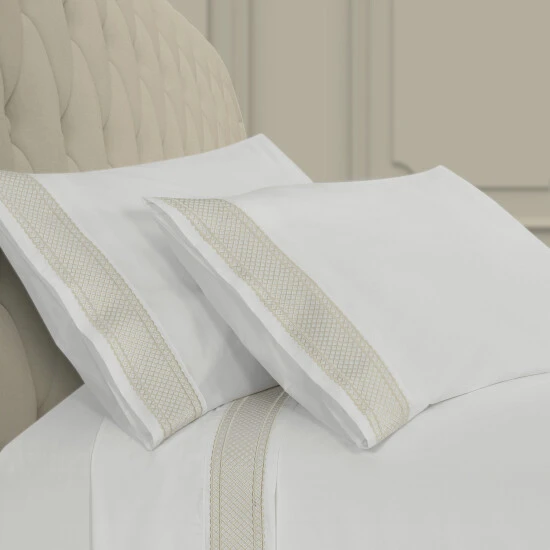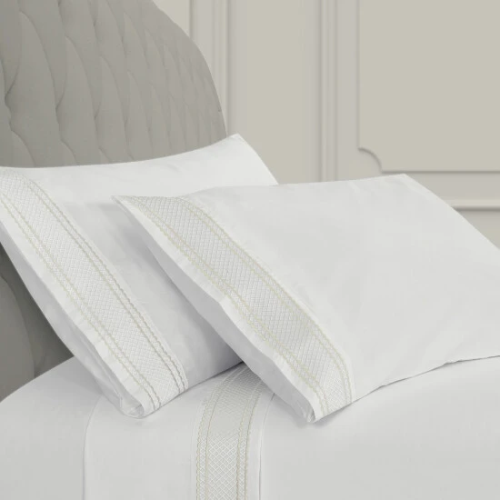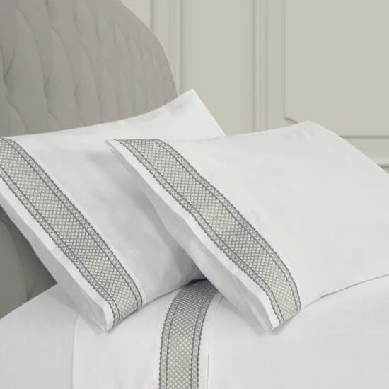 Add a luxurious foundation to your bed with the Montefiore Embroidered Pillowcase Pair. Featuring an embroidered border design, carefully constructed around the centered lattice design. The border is framed with a darker scalloped edge on the top and bottom, providing a dimension of decorator’s detail. Crafted with plush 100% Cotton fabric that feels cool, soft to the touch, and breathable for a rejuvenating night’s sleep. The pillowcases are available in multiple colors to coordinate beautifully with the Five Queens Court Bedding collections and are machine washable for easy care.