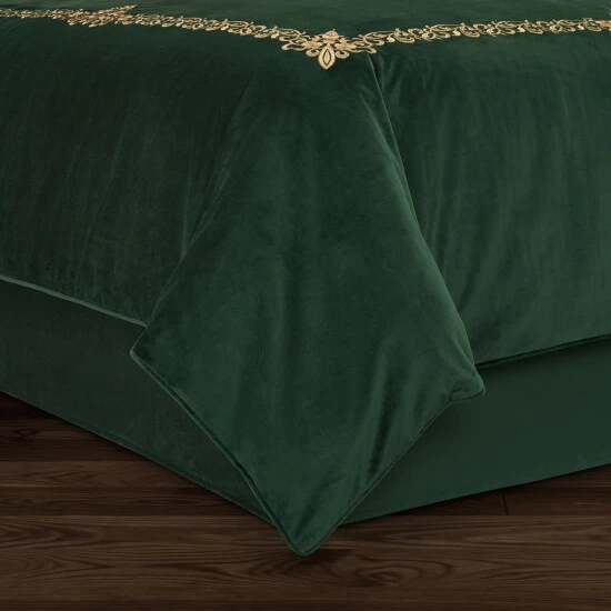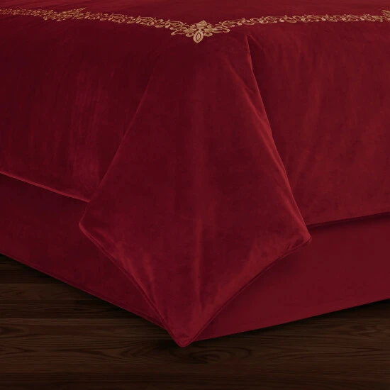 The Nicholas bedskirt lends an elegant touch of Holiday spirit to your bed. The solid plush velvet bedskirt was designed to coordinate with the Nicholas duvet set. It is crafted to drape beautifully with its 15 inch drop, which is finished with split corners for a tailored look. Complete the Nicholas collection and celebrate the season in style with luxurious Holiday bedding, bath and window from Five Queens Court. Available in stunning crimson red or evergreen color options.